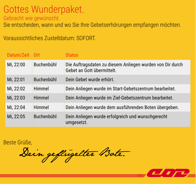 hab ich doch letzte Woche eine E-Mail gekriegt mit dem Betreff: „Ihr Paket kommt zu einem anderen Zeitpunkt“. Äh – Paket? Neugier, dein Name ist Weib – gucken wir halt mal nach. Ach so. Die Flyer für Weihnachten im Schuhkarton! Okay – alles klar. Und wann ? Sendungsverfolgung? – Neugier… siehe oben ;-)